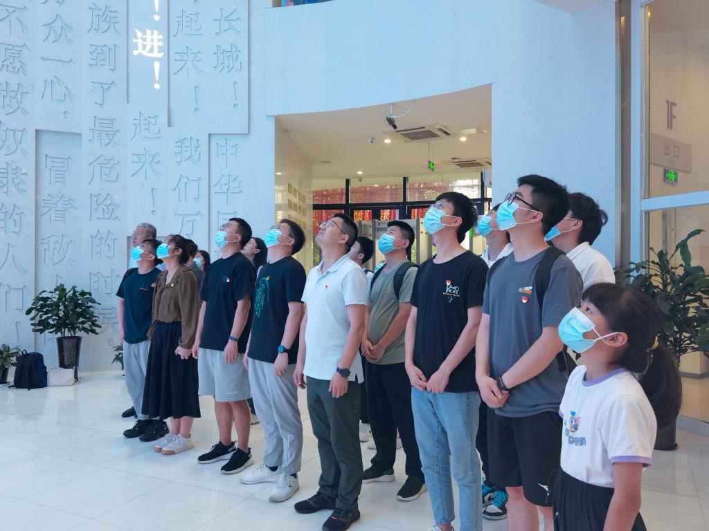 一行人首先来到瑞安国旗馆,跟随讲解员步伐,先后在国旗诞生厅、国旗知识厅、国旗荣耀厅、瑞安发展厅四个主题厅进行参观,共同回顾中华人民共和国国旗诞生的始末。一件件围绕国旗主题陈列的物件,讲述了背后的红色革命故事和瑞安发展沿革。同时,亲身体验了和国旗有关的高科技互动环节,如国旗知识竞答、“我与国旗合个影”等项目。最后全体党员面向党旗庄严宣誓,在七一建党节前夕重温入党初心使命。